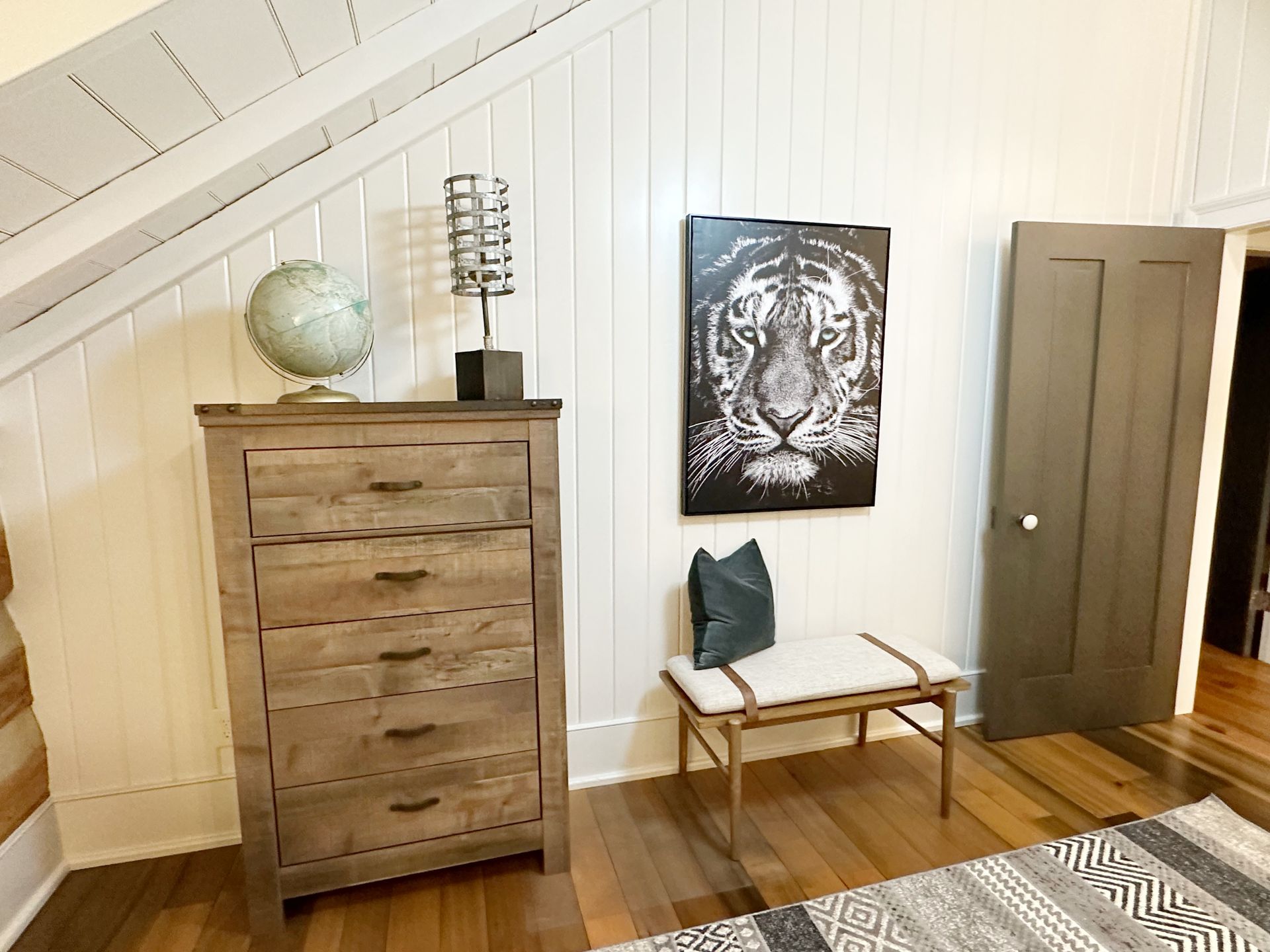 The room's design elements, such as the shiplap walls, track lighting, and mix of modern and rustic furniture, give it a trendy yet comfortable feel. The consistent use of geometric patterns and natural materials creates a harmonious aesthetic throughout. The tiger artworks are strong visual focal points, adding a touch of personality and boldness to the otherwise neutral tones of the room.
